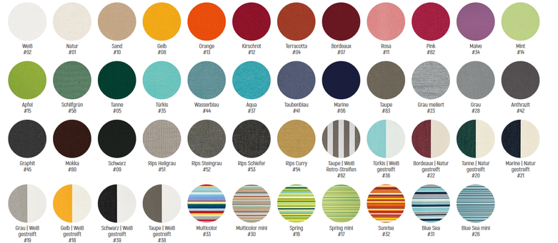 Die Gestelle werden aus verzinktem, pulverbeschichtetem Stahl gefertigt. Die massiven Teakholz-Latten verschrauben wir mit absolut wetterfestem Edelstahl. Passend dazu gibt es Polster, bezogen mit Stoffen aus unserem vielseitigen Programm.